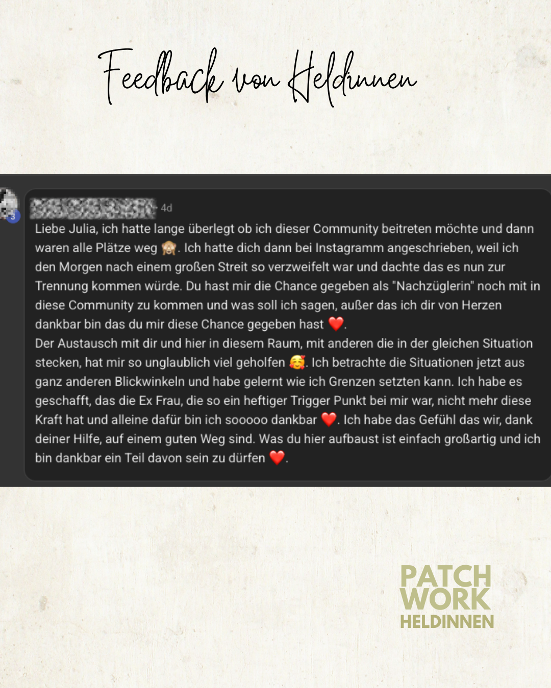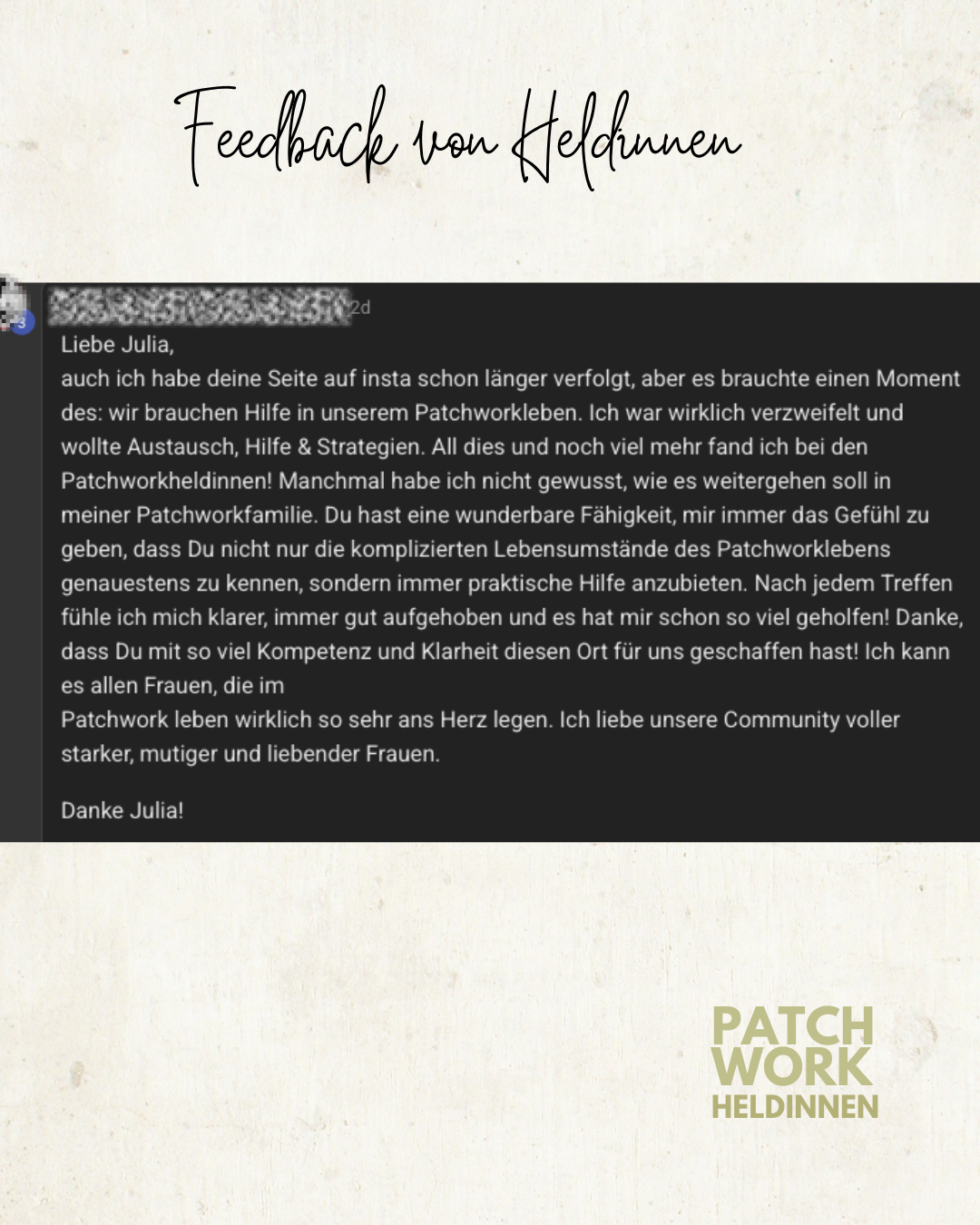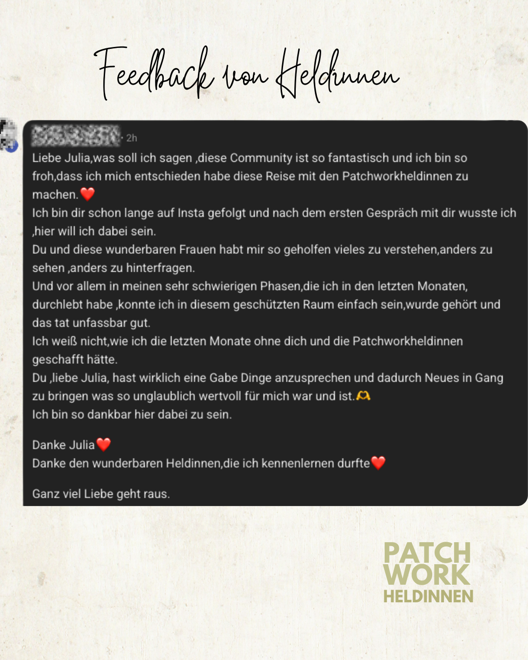 - 1-2 Fokusabende / Coachingabende im Monat für alle PATCHWORKHELDINNEN aus der Community mit mir oder weiteren Gastcoaches für noch mehr Input (z.B. Tina Molin, Stern-Kolumnistin und Paarcoach, Patrizia Datz - Mentorin für Frauen und Mütter)